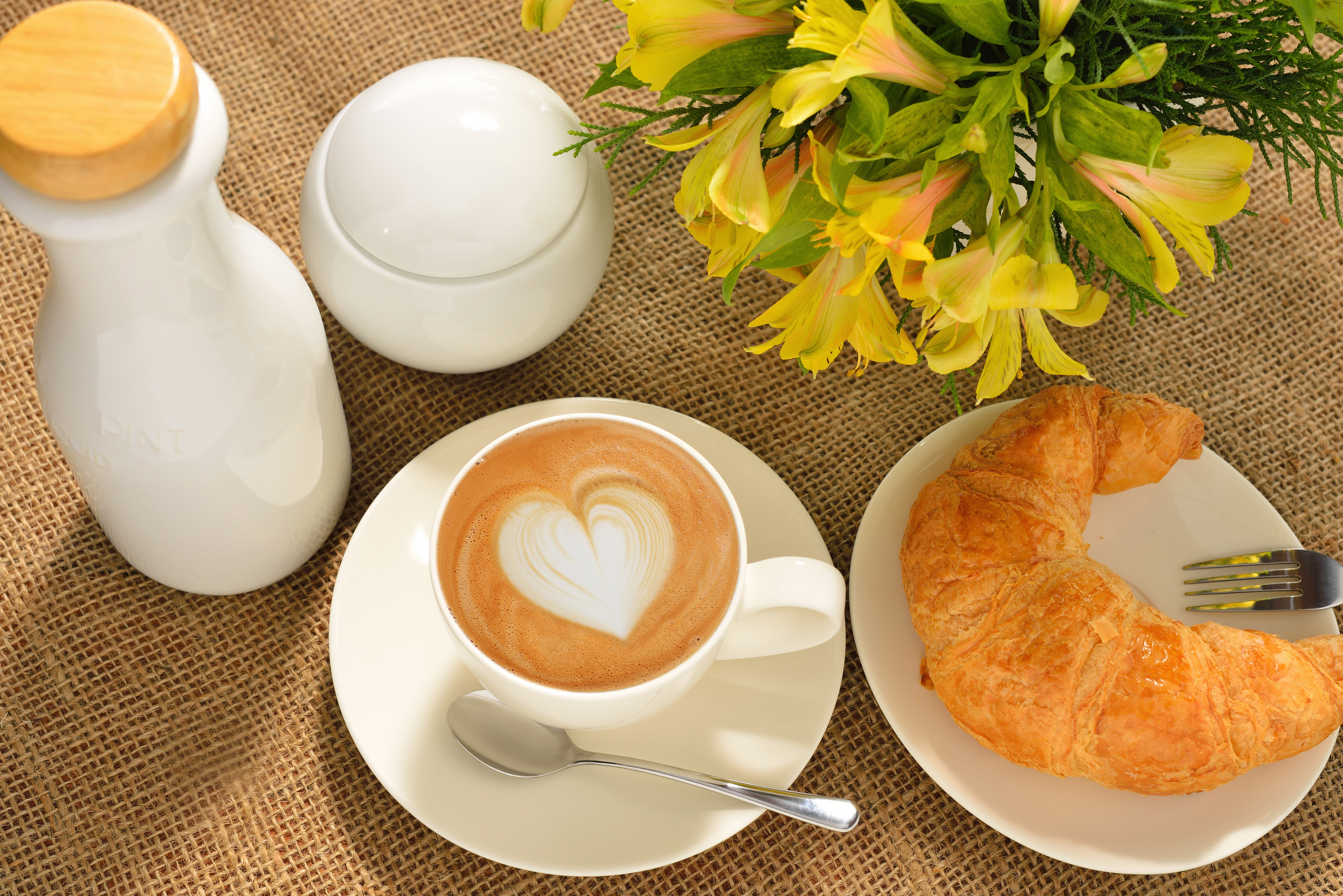This Background: "Cup of Coffee Flowers and Croissant Background" is part of