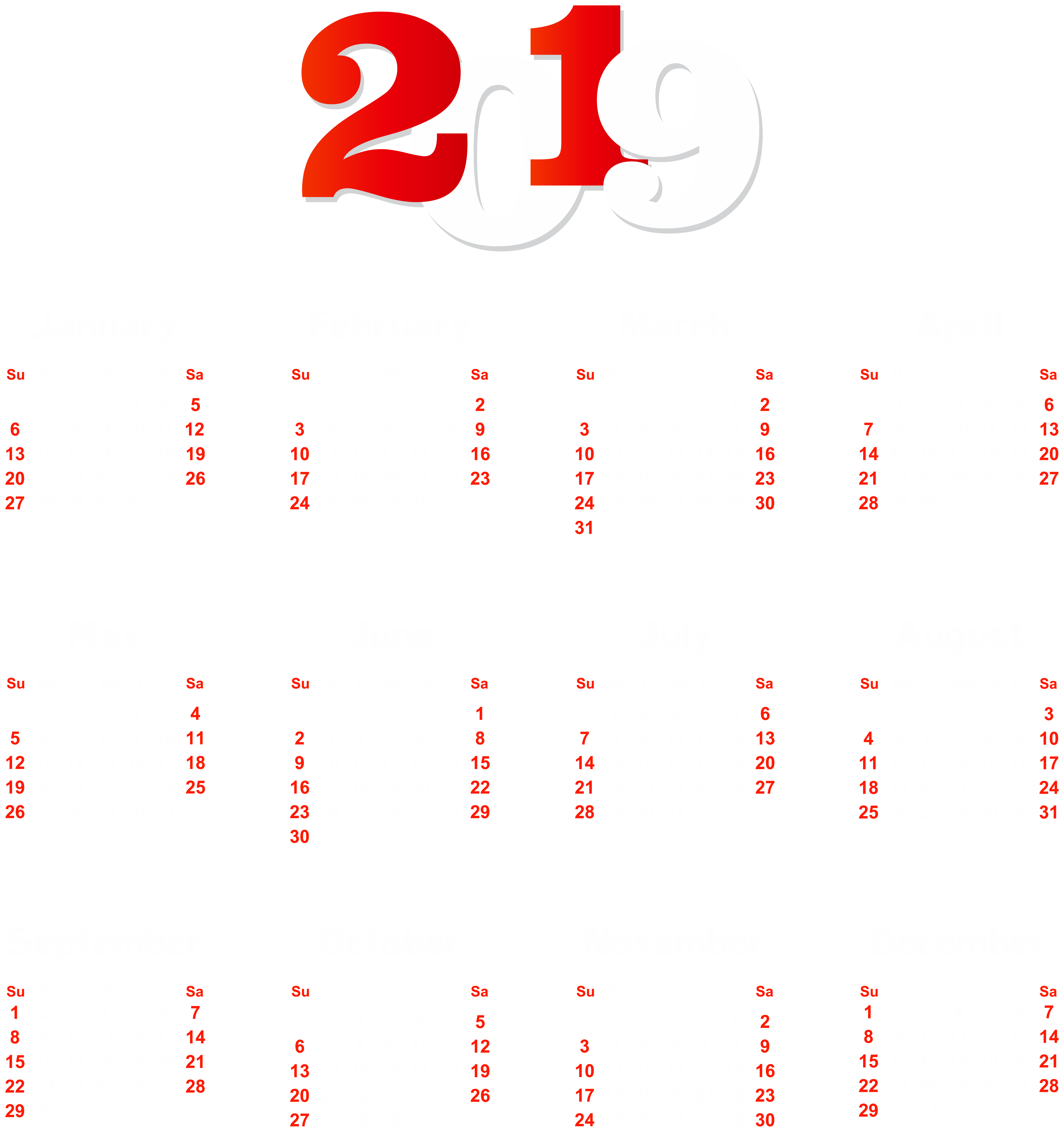 This Clipart Image: "2019 Calendar White Transparent PNG Clip Art" is part of