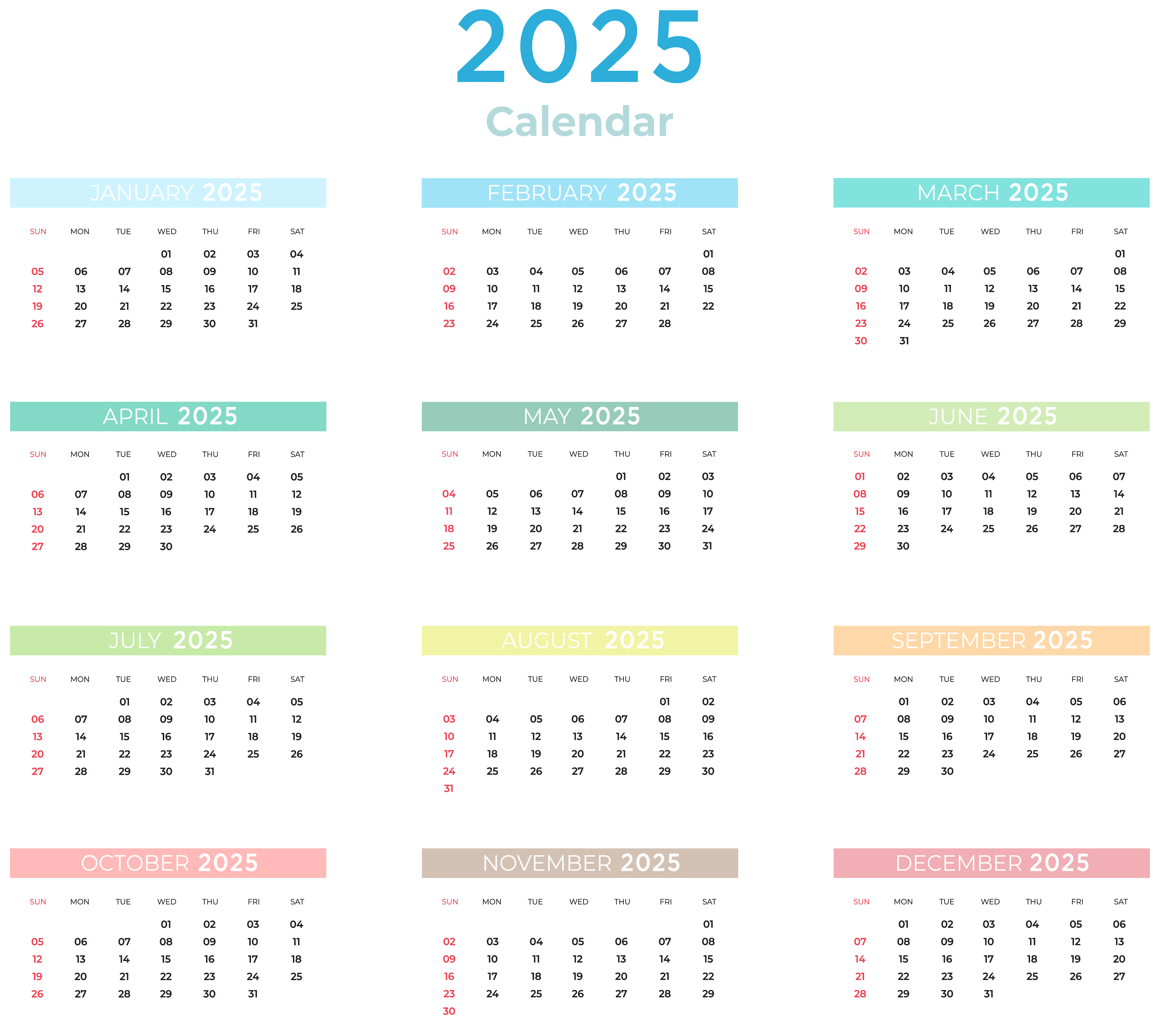 This Clipart Image: "2025 US Calendar with Colors Transparent Clipart" is part of